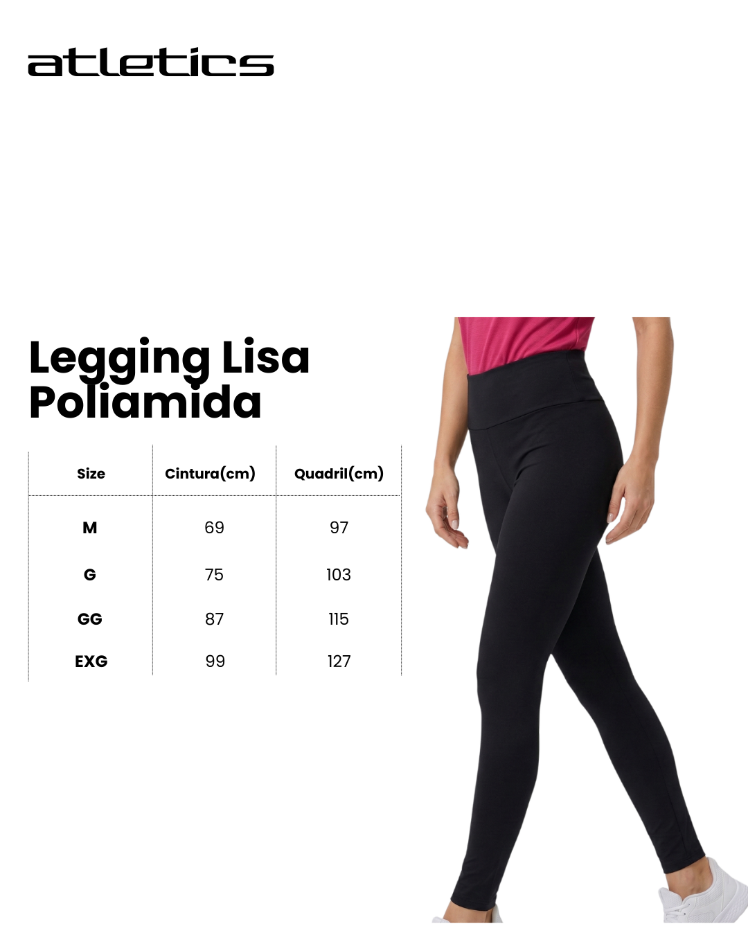 A Legging Poliamida Lisa Preta foi desenvolvida para quem busca conforto, ajuste ao corpo e versatilidade no treino ou no dia a dia. A modelagem é ajustada ao corpo, valorizando a silhueta sem limitar os movimentos. O cós alto proporciona melhor sustentação na região da cintura e do abdômen, ajudando a manter a peça firme durante exercícios como musculação, corrida ou treinos funcionais.